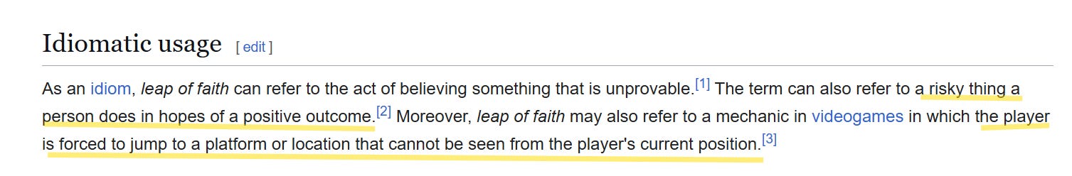 A Leap of Faith is commonly understood to be a decision that one makes, often a huge, life-altering decision, that involves a substantial amount of risk. The faith part is basically making up for the practical part that’s missing.