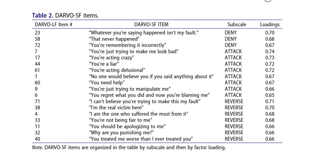 On my LinkedIn feed, a former professor has posted a recent article in which she and her team have validated a short form of the DARVO assessment.